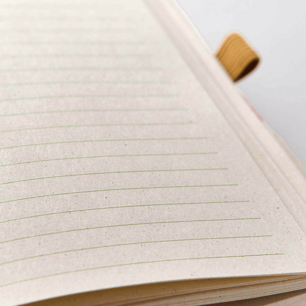・原料の素朴な風合いが残るベージュ色の紙と落ち着いたグリーンの罫線