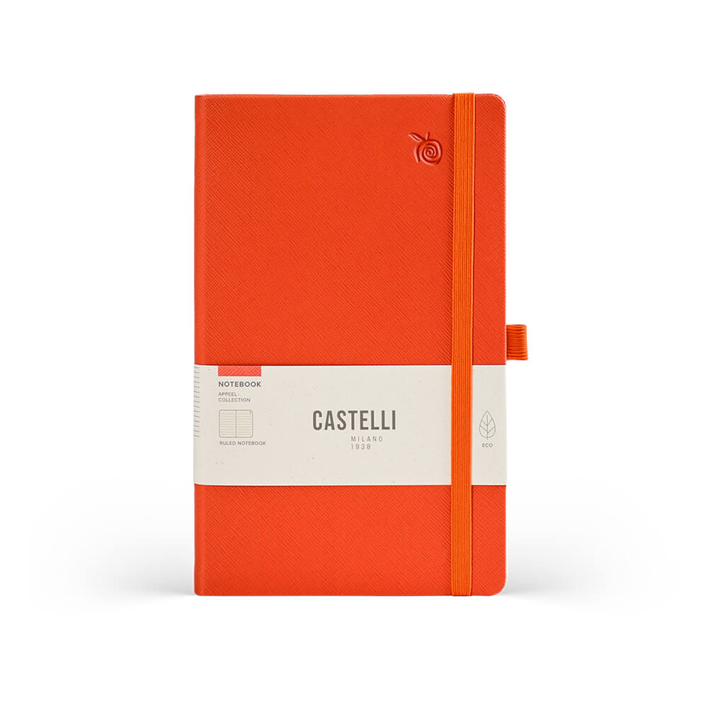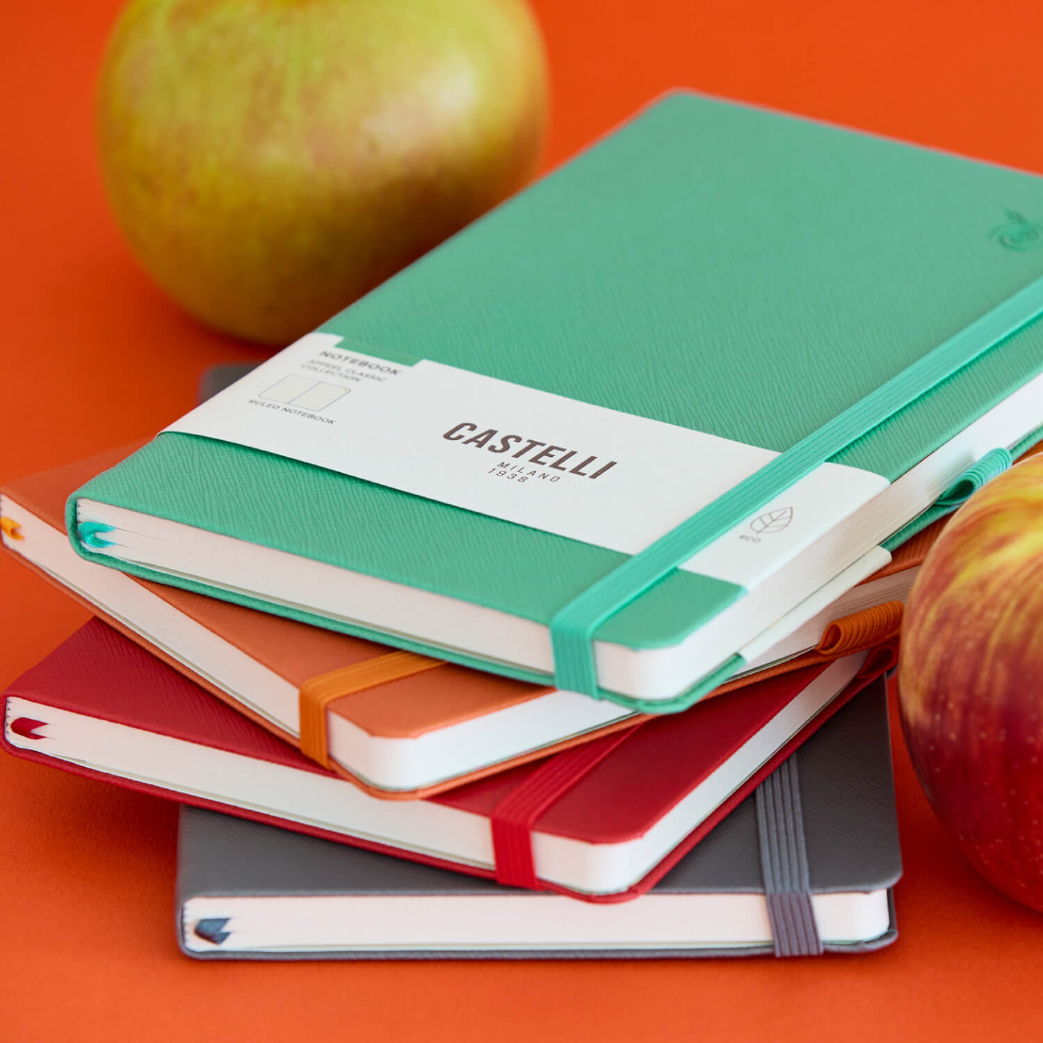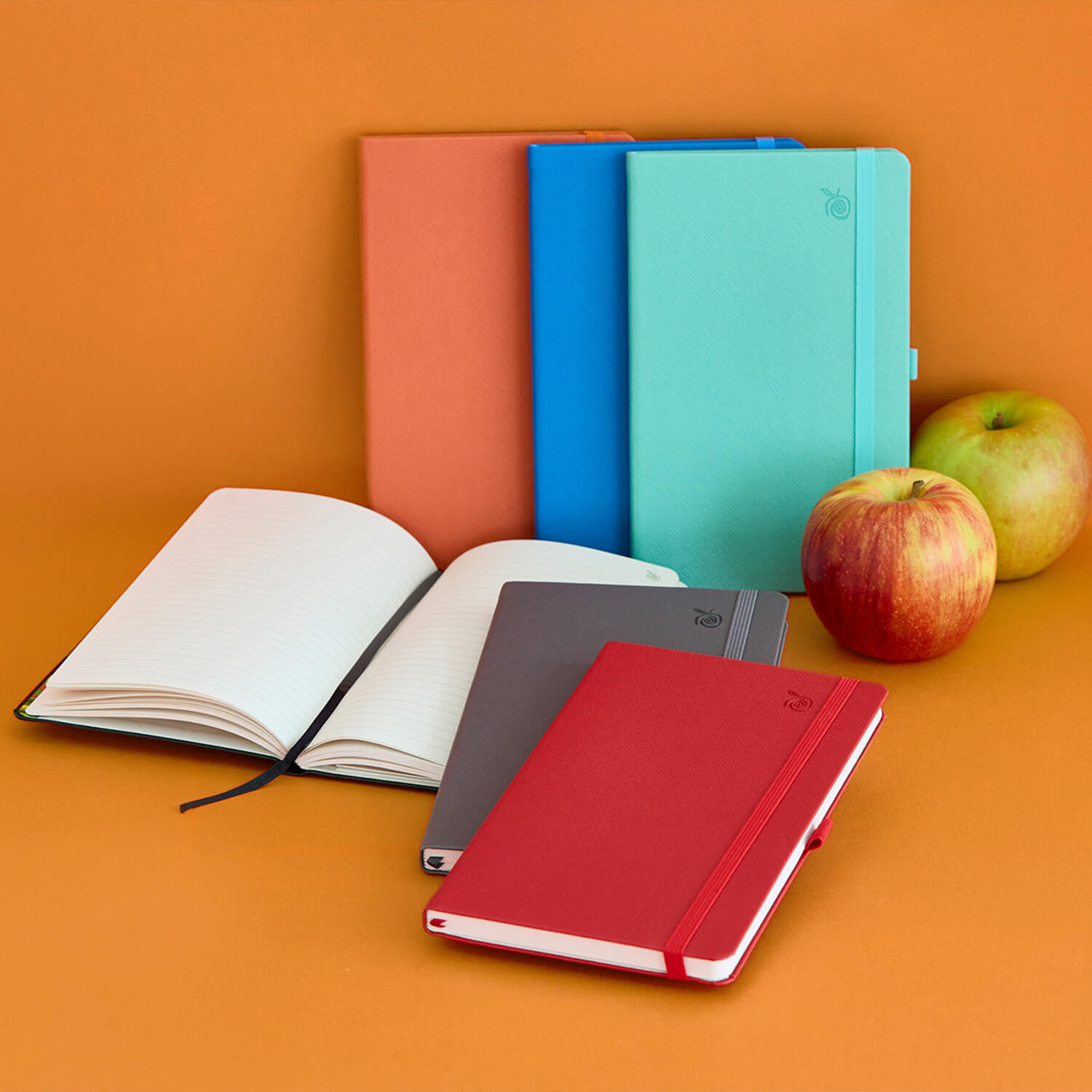 〈アッピル クラシック〉は、リンゴの皮やその他の野菜の繊維を細かく砕き、紙の原料として使用しています。リアルレザーのように見える美しいカバーは、イタリアのオルティゼーイで製造された廃棄されるリンゴの皮などをリサイクルした素材。洗練されたデザインと独特の触り心地を兼ね備えたサフィアーノ風仕上げです。本国のカラーラインナップから日本では6色をピックアップしました。