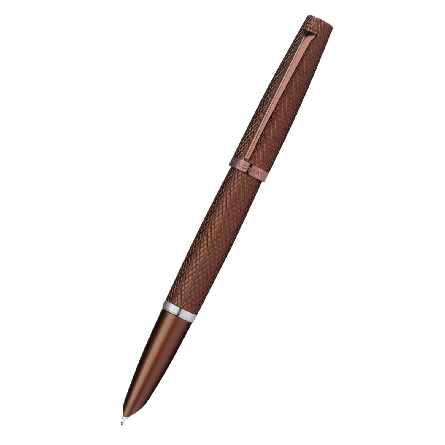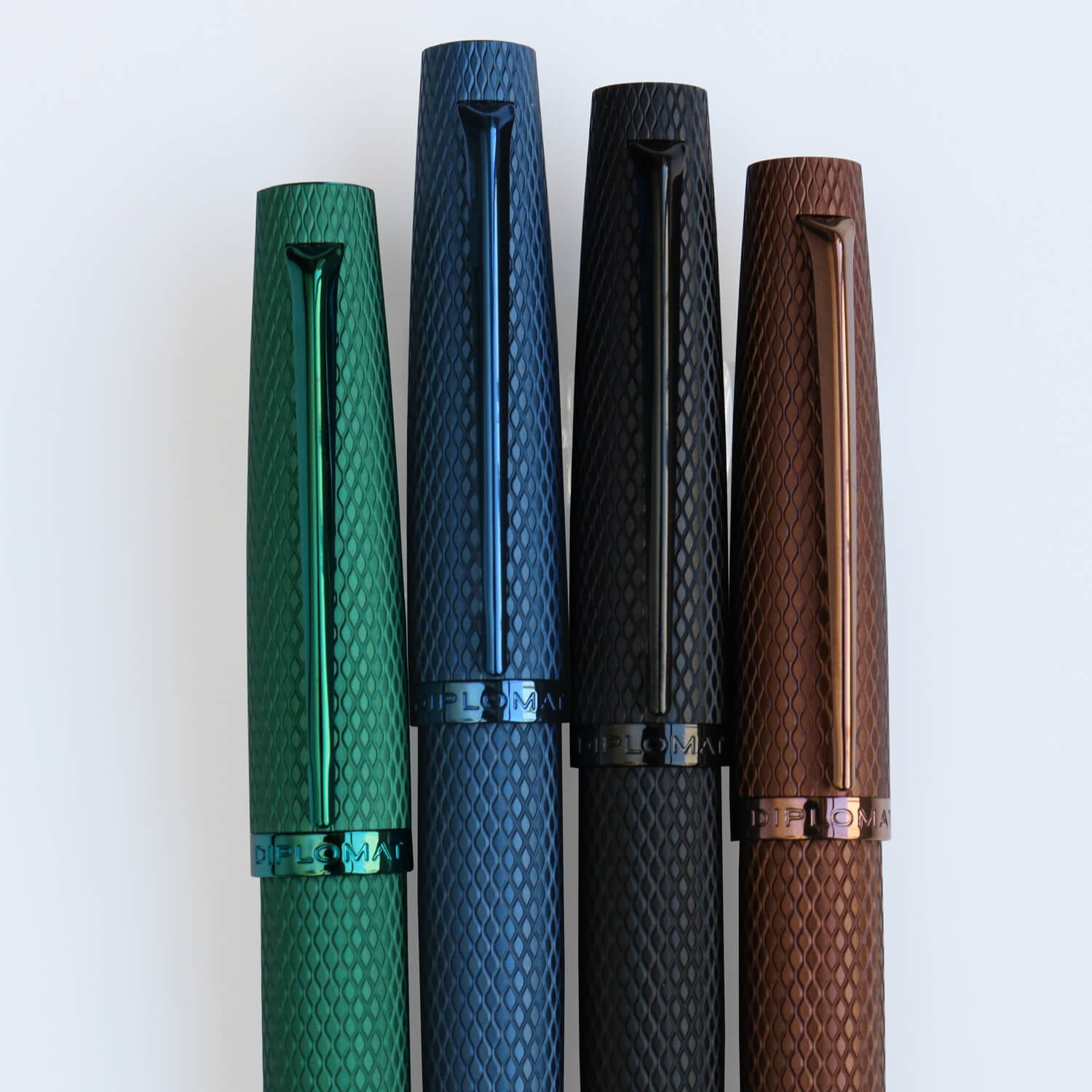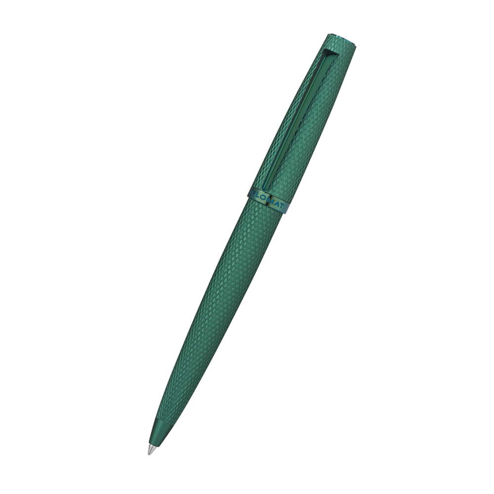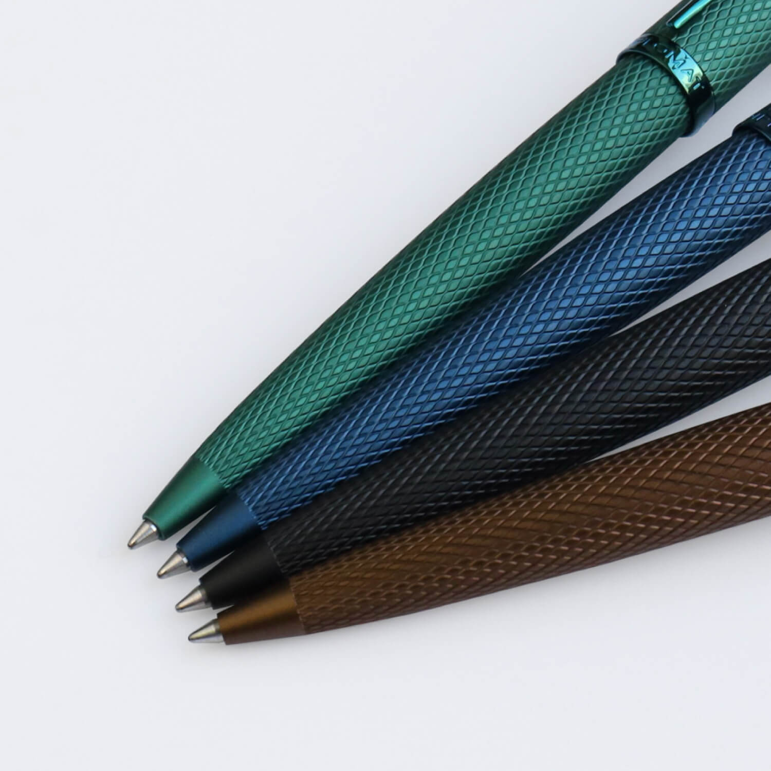爬虫類のウロコを思わせるギロシェパターンの彫刻が全面に施されたアルミニウム製のボディが特徴的。アノダイズ加工のメタリックな風合いの仕上げとも好相性です。万年筆の流線形のフォルムを完成させるフーデッドニブは、滑らかな書き味を生み出すよう緻密に設計されています。新たに加わったボールペンは、27gと手馴染みのよい重量で、絶妙なバランスとイージーフロー芯による軽やかな書き心地を実現しました。外観、品質ともに特別な筆記体験をお届けします。