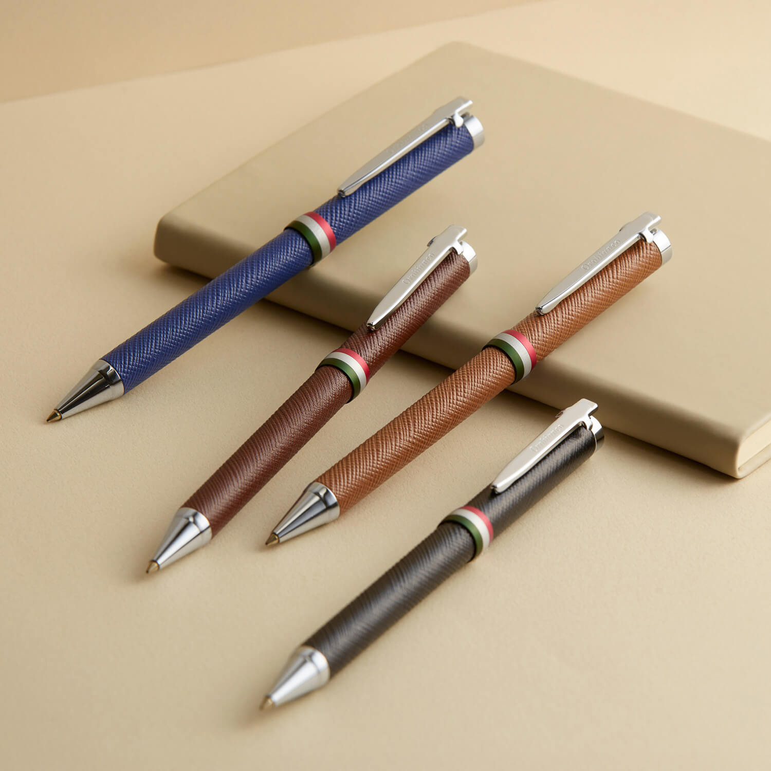 真鍮製のボディに本革のシートを丁寧に巻いて仕上げられており、革の表面はサフィアーノ調の型押しで傷に強く耐久性に優れています。使い込むほどに手に馴染む、本革の感触が楽しめるコレクションです。