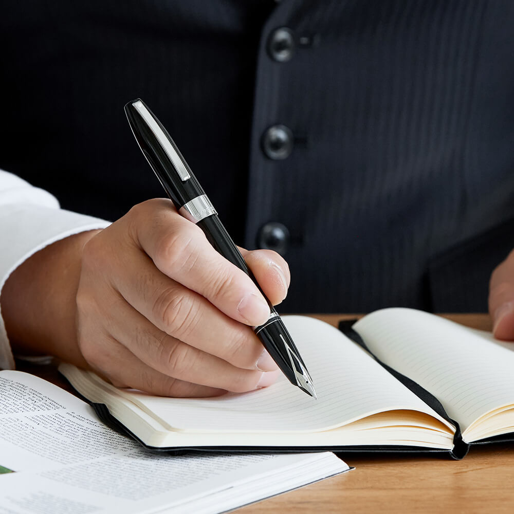 高級感あふれるブラックラッカー仕上げのシガーシェイプボディに、万年筆にはリファインされた特徴的なインレイニブを搭載、ボールペンはスムースな手ごたえのツイスト式で、シェーファーブランドのラインナップにラグジュアリーな一面を加えます。